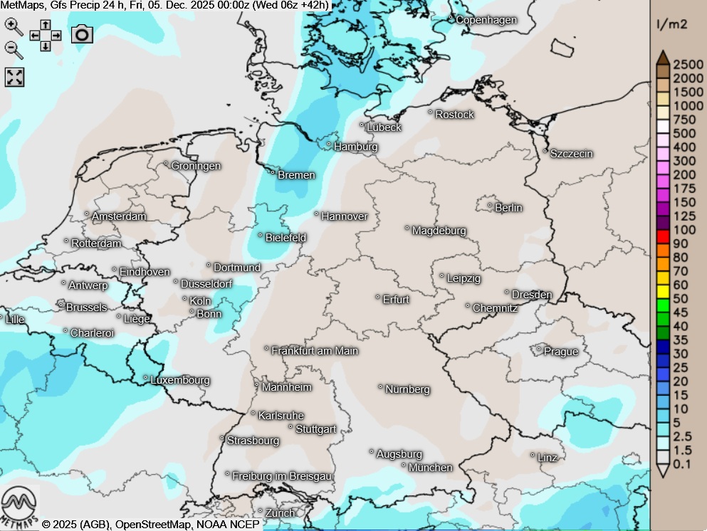 Die Temperatur- und Wetterkarte für Donnerstagfrüh (06:00 Uhr) sowie die 24-Stunden-Regenmengen für Donnerstag nach GFS:
