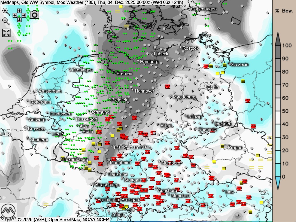 Am Donnerstag zeigt sich der Himmel über weiten Landesteilen bedeckt oder es ist nebelig-trüb. Größere Auflockerungen beschränken sich am Donnerstag vor allem auf das höhere Bergland. Im Norden und Nordwesten fällt zeitweise etwas Regen, sonst bleibt es meist niederschlagsfrei.