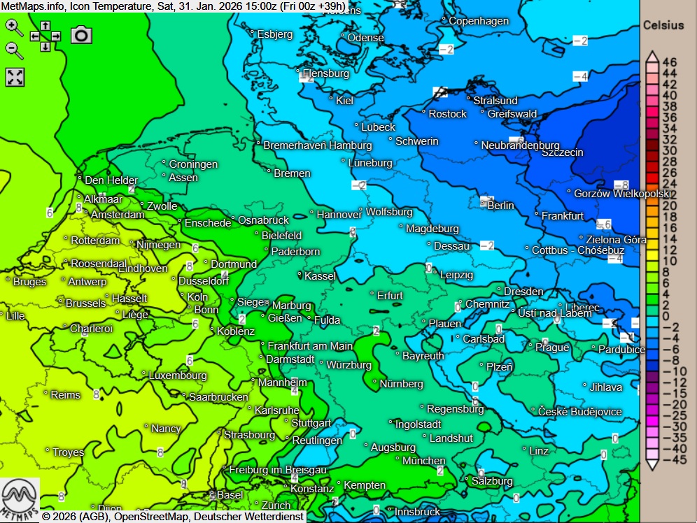 Während in den Norden und Osten mit östlicher Strömung weiterhin kalte Kontinentalluft einfließt, gibt im Süden und Westen milde Meersluft den Ton an. Höchstwerte um 10 Grad zeigt das Thermometer im Rheintal aktuell, eisige -6 Grad herrschen dagegen am Stettiner Haff.
