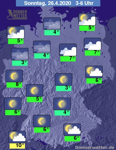 In der Nacht zum Sonntag ist der Himmel größtenteils sternenklar, im Norden und Osten halten sich gebietsweise dichte Wolken, die jedoch keinen Regen bringen. Die Temperatur sinkt auf 10 Grad im Breisgau und bis 3 Grad im Eichsfeld.