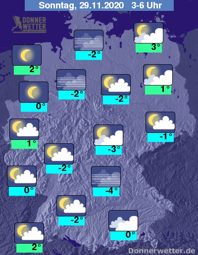 Am Sonntag zeigt sich das Wetter zum Teil stark bewölkt oder trüb, gebietsweise wird es aber auch sonnig, dabei bleibt es trocken. Die Temperatur erreicht nur rund 1 Grad in Erfurt und bis 7 Grad in Freiburg.