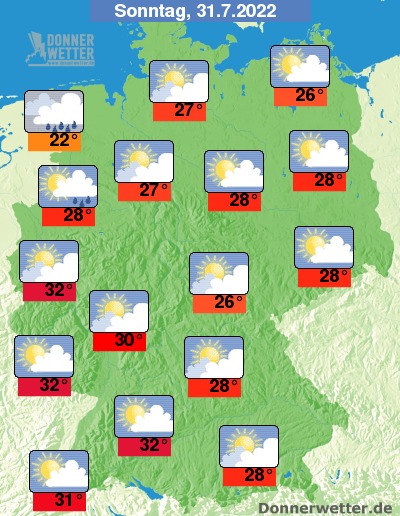 Am Sonntag ziehen im Westen und Norden oft einige, zum Teil dichte Wolken durch, dazu bleibt es zunächst trocken, gegen Abend sind dann Schauer möglich. Im übrigen Bundesgebiet ist es meist heiter, teilweise ziehen auch mehr Wolken durch, aber es bleibt trocken. Die Temperatur steigt auf 22 Grad an der Nordsee und bis 32 Grad am Ober- und Mittelrhein.