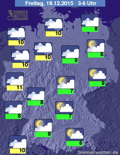 In der Nacht zum Freitag ist es im Norden und Westen meist dicht bewölkt, aber zunächst trocken, weiter nach Süden und Osten zeigt sich der Himmel oft noch locker oder aufgelockert bewölkt. In der zweiten Nachthälfte ziehen dichte Regenwolken in den Norden und Westen von Deutschland. Bis zum Morgen regnet es auch in weiten Teilen des Ostens und bis etwa nördlich des Mains, im südlichen Baden-Württemberg und im südlichen Bayern bleibt es teils aufgelockert bewölkt und dazu weitgehend trocken. Die Temperatur sinkt auf 11 Grad in Aachen und bis 6 Grad in Augsburg.