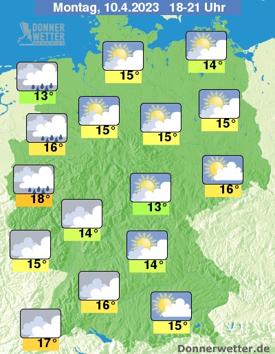 Heute Abend werden die Wolken nach Westen hin noch kompakter und es setzt Regen ein, der langsam weiter bis zur Mitte Deutschlands vorankommt. Über der Osthälfte ist es hingegen noch oft wechselnd bis aufgelockert, teils aber auch schon stark bewölkt, allerdings noch trocken. Die Temperatur liegt bei 13 Grad in Nürnberg und bis zu 18 Grad in Köln.