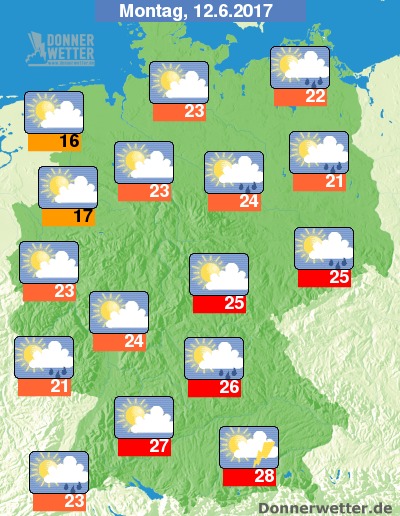 Am Montag bleibt es im Süden und Südosten Deutschlands oft stark bewölkt und hier bilden sich zeitweise Schauer sowie mögliche Gewitter, sonst zeigen sich aber auch immer wieder heitere Abschnitte, die jedoch gebietsweise von dichteren Wolken und lokal auch einzelnen Schauern und Gewittern unterbrochen werden. Die Temperatur steigt auf kühle 16 Grad in Bremerhaven und bis auf schwülwarme 28 Grad in München.