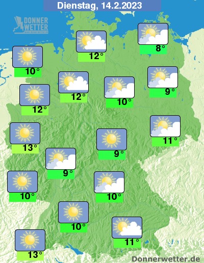 Heute ist es heiter bis sonnig, im Osten, Nordosten und Norden halten sich hier und da einige, teilweise auch dichte Wolken. Es bleibt trocken bei Werten von 8 Grad in Stralsund und bis 13 Grad in Freiburg.
