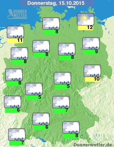 Am Donnerstag bleibt es im Land bei einer meist geschlossenen Wolkendecke, besonders im Norden kann es gebietsweise aber auch etwas auflockern. Es fällt immer wieder, vor allem über der breiten Mitte Deutschland auch zum Teil langanhaltender Regen. Die Temperatur steigt auf nasskalte 5 Grad im Thüringer Becken und bis immerhin 12 Grad in Rostock.