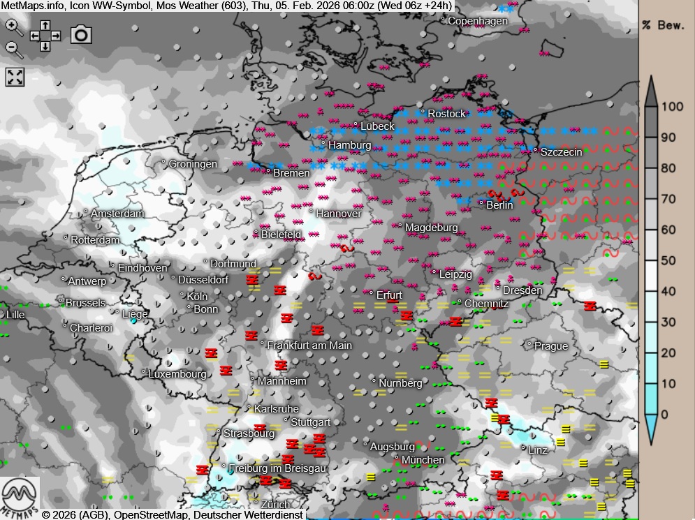 Die Temperatur- und Wetterkarte für Donnerstagfrüh (06:00 Uhr) sowie die 24-Stunden-Schneemengen für Donnerstag nach ICON: