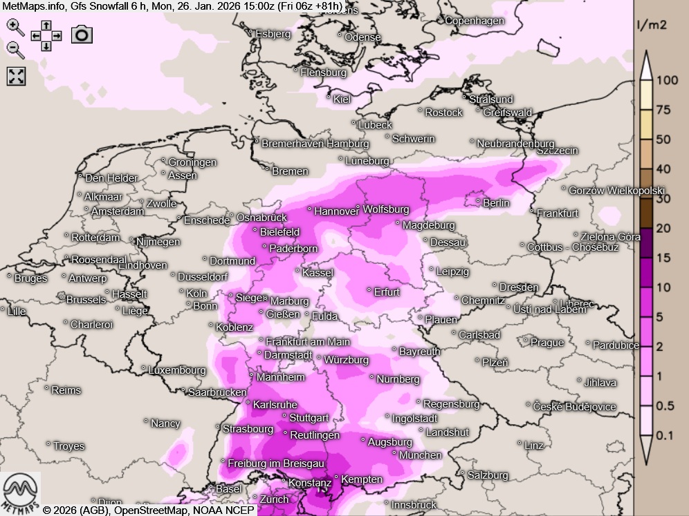 Die Wetterkarte für 06:00 Uhr sowie die Sechs-Stunden-Schneemengen bis 15:00 Uhr nach GFS: