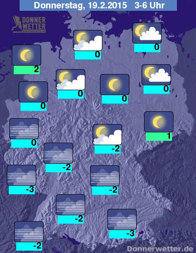 In der folgenden Nacht ziehen im Norden und Osten gebietsweise einige, teils auch dichte Wolken durch, die jedoch keinen Regen bringen. In den anderen Landesteilen ist es zunächst meist sternenklar, jedoch bildet sich vor allem im Süden und Westen häufig auch Nebel oder Hochnebel, dabei bleibt es trocken. Die Temperatur sinkt auf 2 Grad in Cuxhaven und bis -3 Grad am Pfälzer Wald.
