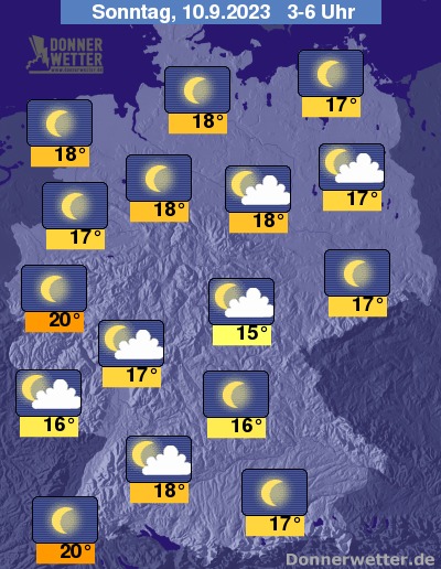 In der folgenden Nacht ist der Himmel zumeist sternenklar, es kann aber auch leichte Bewölkung durchziehen, dazu bleibt es trocken. Die Temperatur sinkt auf tropische 20 Grad in Köln und Freiburg und etwa 15 Grad in Jena.