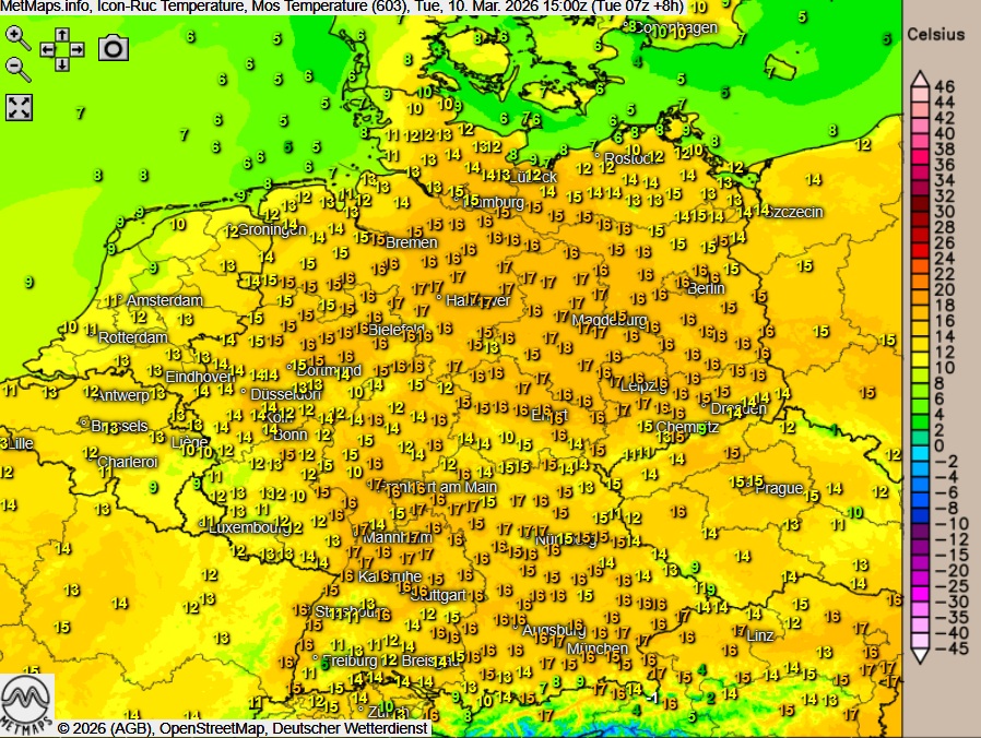 Die Temperaturen erreichen am Nachmittag Höchstwerte um 8 Grad an der Küsten und um 19 Grad im Rhein-Main-Gebiet.