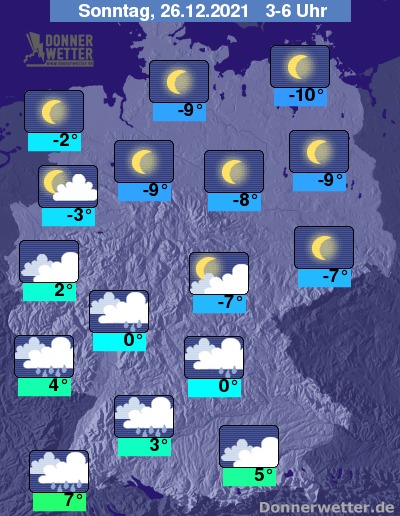 In der folgenden Nacht bleibt es über der Südhälfte der Republik weitgehend bedeckt und vor allem über Baden-Württemberg und Bayern fällt zeitweise Regen oder Schneeregen. Über der Nordhälfte des Landes ist der Himmel verbreitet sternenklar, dazu bleibt es trocken. Die Temperatur sinkt auf 7 Grad in Freiburg und bis -10 Grad in Neubrandenburg.