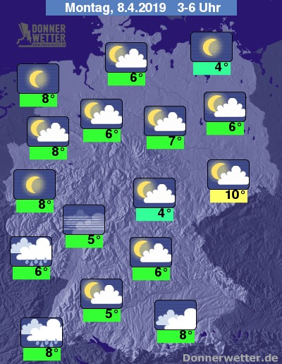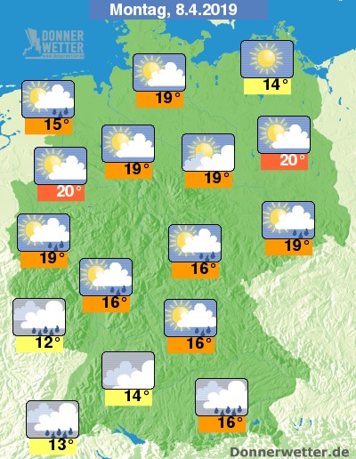 Am Montag zeigen sich über der Südhälfte des Landes zum Teil Aufheiterungen, es ziehen aber auch dichte Wolken durch, dabei bilden sich einzelne Schauer, örtlich sind auch Gewitter möglich. Im Norden bleibt es den Tag über heiter bis sonnig und trocken. Die Temperatur steigt auf 12 Grad am Pfälzer Wald und bis 20 Grad in Berlin.
