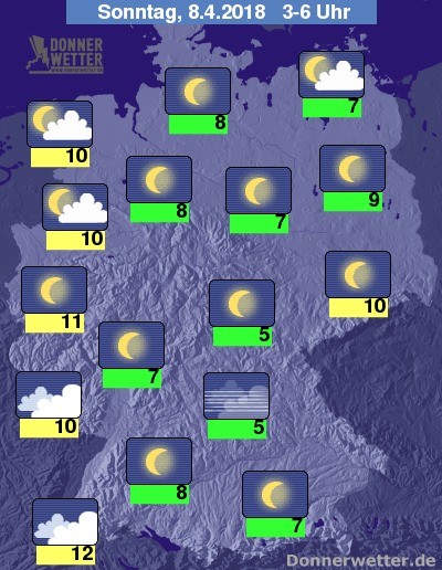 In der folgenden Nacht zeigt sich der Himmel über Deutschland verbreitet sternenklar, mehr und zum Teil auch dichte Wolken sind jedoch westlich von Rhein und Ems möglich, dazu bleibt es aber trocken. Die Temperatur sinkt auf 12 Grad in Freiburg und bis etwa 5 Grad im Thüringer Becken.