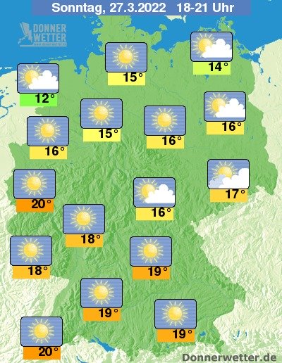 Heute Abend lockert es auch im Osten und Nordosten zumeist auf, teilweise halten sich hier aber auch viele und hier und da auch dichte Wolken. Im übrigen Land ist es weitgehend sonnig. Es bleibt landesweit trocken bei 12 Grad in Cuxhaven und bis 20 Grad in Freiburg.