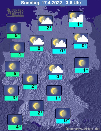 In der folgenden Nacht zeigt sich der Himmel sternenklar oder locker bewölkt, lediglich im Ostseeumfeld sind gebietsweise einige Wolken möglich. Es bleibt landesweit trocken bei Tiefstwerten von 5 Grad in Cuxhaven und etwa 0 Grad in Erfurt.