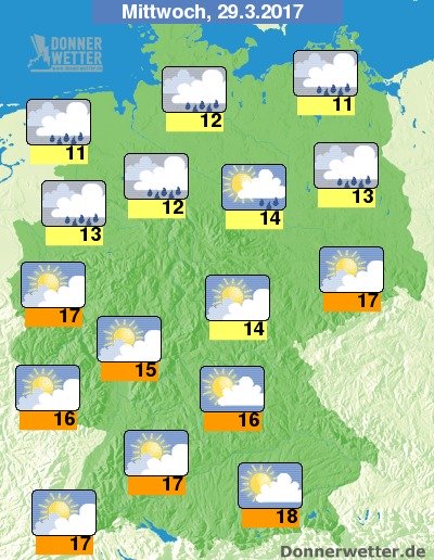 Am Mittwoch ist es bevorzugt im Süden oft heiter, hier und da auch aufgelockert bewölkt, aber trocken. Über der Nordhälfte halten sich dagegen überwiegend dichte Wolken und es fällt auch gebietsweise Regen. Die Temperatur steigt auf 11 Grad in Vorpommern und bis 18 Grad in München.
