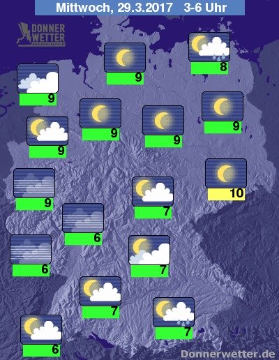 In der kommenden Nacht zieht im Nord- und Ostseeumfeld oft starke Bewölkung auf, dabei fällt hier auch gebietsweise Regen. Auch am Alpenrand sind bei teils dichteren Wolken einzelne Schauer nicht auszuschließen. Im übrigen Land zeigt sich der Himmel hingegen verbreitet locker bewölkt, oft auch sternenklar und es bleibt trocken. Die Temperatur sinkt auf eher milde 10 bis 6 Grad.