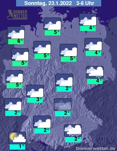 In der Nacht zum Sonntag ziehen Regen und Schnee im Südosten nach Österreich ab, sonst bleibt es im Süden bereits meist trocken, aber oft neblig-trüb. Im großen Rest der Republik ist es bedeckt, aber es bleibt bis auf selten Tropfen trocken. Die Temperatur sinkt auf 6 Grad an der Nordsee und bis 1 Grad im Oberrheingraben.