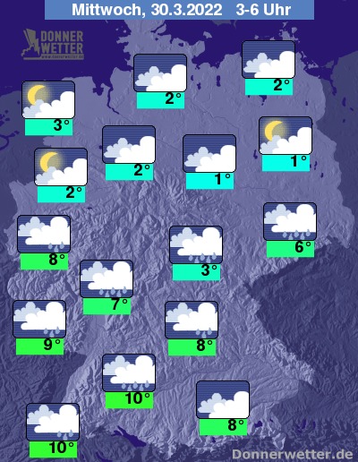 In der folgenden Nacht fällt über der Südhälfte unter dichten Wolken verbreitet Regen, zum Teil auch Schneeregen oder Schnee. Im Norden ist es teils stark, teils aufgelockert bewölkt und dazu trocken. Die Temperatur sinkt auf 10 Grad in Freiburg und bis 1 Grad in Berlin.