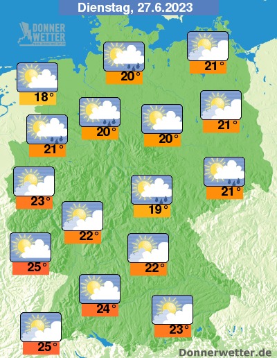 Am Dienstag zeigen sich zum Teil heitere Abschnitte, teilweise zieht starke Bewölkung durch. Im Norden und Osten bilden sich einzelne Schauer, im übrigen Bundesgebiet bleibt es hingegen weitgehend trocken. Die Temperatur erreicht 18 Grad an der Nordsee und bis 25 Grad am Oberrhein.