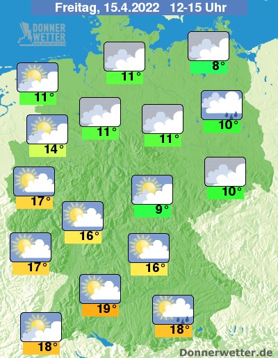 Heute Abend bleibt es über der Nordosthälfte weiterhin stark bis dicht bewölkt, Schauer bilden sich dabei aber nur noch selten. Im Süden und Westen ist es überwiegend heiter und teils sonnig, jedoch ziehen gebietsweise auch einige und vor allem an den Alpen auch dichte Wolken durch, hier sind einzelne Schauer möglich, sonst bleibt es trocken. Die Temperatur liegt bei nur 6 Grad auf Rügen, aber bis 19 Grad im Breisgau.