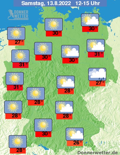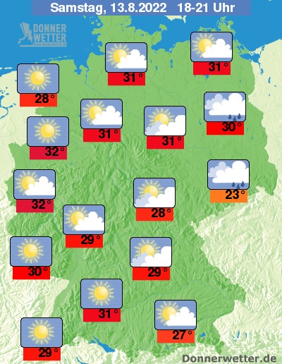 Heute Abend können sich in den östlichen Landesteilen einzelne Schauer, selten auch Gewitter bilden, auch sonst ist es über der Osthälfte teils stark bewölkt, teils aufgelockert bewölkt, jedoch weitgehend trocken. Über der Westhälfte bleibt es hingegen heiter bis sonnig und trocken. Die Temperatur liegt bei 23 Grad in Dresden und 32 Grad in Köln.