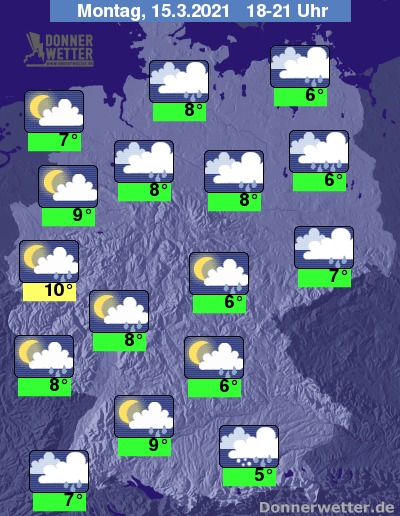 In den Abendstunden zeigt sich der Himmel über der Landesmitte sowie im Westen und Nordwesten Deutschlands überwiegend locker oder aufgelockert bewölkt. An Weser, Oder und Donau bleibt die Wolkendecke zumeist geschlossen oder es ist stark bewölkt. Zunächst muss noch verbreitet mit Schauern gerechnet werden, die dort wo es auflockert aber verbreitet abklingen. Östlich der Elbe und im Süden Bayerns und Baden-Württembergs setzten sich die Niederschläge weiter fort, die Schneefallgrenze sinkt im Süden teils bis in tiefe Lagen.