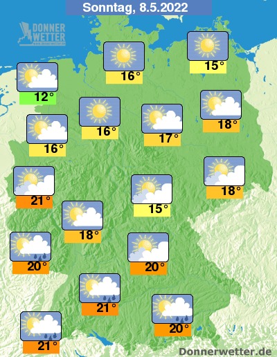 Am Sonntag ist es überwiegend heiter bis sonnig und dazu trocken, hier und da ziehen jedoch auch einige Wolken durch. Im Süden bilden sich bei zum Teil dichten Wolken lokale Schauer. Die Temperatur steigt auf 12 Grad an der Nordsee und bis 21 Grad am Oberrhein.