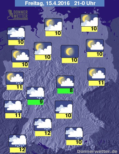 In der Nacht zum Samstag bleibt es im Süden bei dichter Bewölkung und zeitweisem Regen, aber auch über der breiten Mitte und dem Nordwesten des Landes ist es oft stark bewölkt und es können sich einzelne Schauer bilden. Im Norden und Nordosten ist es meist nur locker oder aufgelockert bewölkt, zum Teil auch sternenklar und es bleibt überwiegend trocken. Die Temperatur sinkt auf 10 Grad in Freiburg und bis 6 Grad in Neubrandenburg.