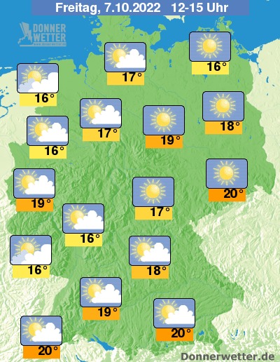 Heute Nachmittag zeigt sich über dem Land häufig die Sonne und es ziehen meist nur lockere, hier und da auch mal einige Wolken durch. Vor allem im Osten und Nordosten ist es meist sonnig. Bei Werten von 16 Grad an den Küsten und 20 Grad im Alpenvorland bleibt es trocken.