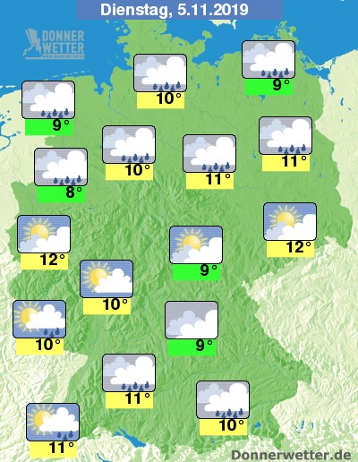 Am Dienstag ist es im Norden sowie im Süden stark bewölkt und hier fällt zeitweise Regen. Im übrigen Bundesgebiet ist es auch oft locker bis aufgelockert, teils jedoch auch stark bewölkt, dazu bleibt es weitgehend trocken. Es werden 8 Grad in Münster und bis 12 Grad in Dresden erreicht.