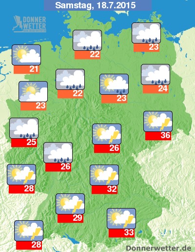 Am Samstag sind besonders vormittags oft heitere Abschnitte möglich, es können sich aber auch bereits einzelne Schauer und lokale Gewitter entwickeln. Am Nachmittag blitzt und donnert es besonders über der Südosthälfte des Landes, dabei besteht teils Unwettergefahr. Im Nordwesten bleibt es dann meist trocken und oft locker bewölkt. Die Temperatur steigt auf 21 Grad an der Nordsee und auf schwülheiße 36 Grad in Dresden.