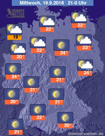 In späten Abend und in der Nacht zeigt sich der Himmel in der Nordwesthälfte sowie entlang der Oder, später dann auch entlang des Rheins, locker bewölkt. Im Süden sowie in der Mittel bleibt es meist sternenklar. Einzelne Schauer können regional in Sachsen fallen, sonst bleibt es zumeist trocken.