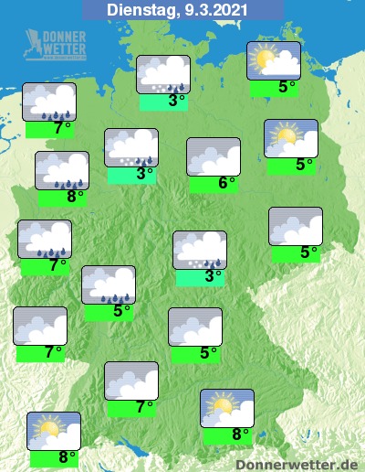 Am Dienstag ist der Himmel meist stark bewölkt oder bedeckt, Auflockerungen begrenzen sich im Tagesverlauf vor allem auf den Nordosten sowie den äußersten Süden Deutschlands. Mit Schauern muss heute vor allem Westhälfte und der Landesmitte gerechnet werden, an der Weser sowie den Mittelgebirgen fält auch Schneeregen oder Schnee.