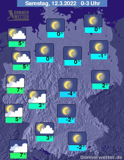In der Nacht auf Samstag verdichten sich die Wolken in der Westhälfte weiter, so dass es hier meist bedeckt oder aufgelockert bewölkt ist. Es bleibt aber trocken. In der Osthälfte bleibt der Himmel meist wolkenfrei.