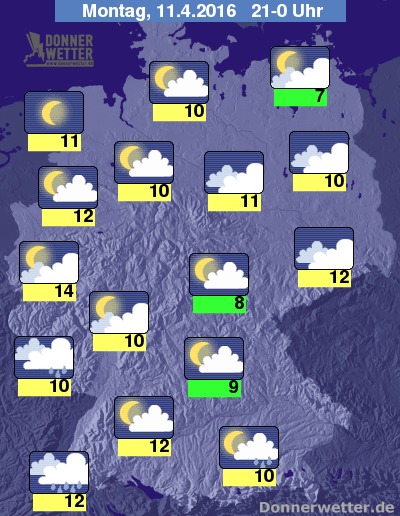 In der Nacht zum Dienstag ist es über dem Süden und Westen zunächst teils stark, teils aufgelockert bewölkt und weitgehend trocken, gegen Morgen nimmt die Bewölkung hier allgemein zu und es fällt gebietsweise Regen. Weiter nach Nordosten hin ist es aufgelockert bis stark bewölkt und zumeist trocken. Die Temperatur sinkt auf 10 Grad in Dresden und 3 Grad im Thüringer Becken.