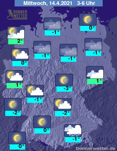 In der Nacht zum Mittwoch klingen letzte Niederschläge im Südosten ab, sonst ist es schon verbreitet sternenklar oder nur locker bewölkt. An der Nordsee ist es oft auch stark bewölkt, dazu bleibt es aber weitgehend trocken. Die Temperatur sinkt auf 2 Grad in Emden und bis -3 Grad in Jena.