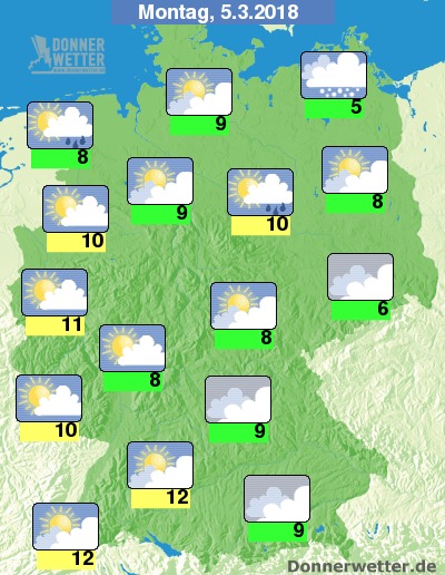 Die neue Woche startet in weiten Teilen Deutschlands mit freundlichem vorfrühlingshaftem Wetter. Dichte Wolken halten sich jedoch noch meist über dem Süden, Osten und Nordosten, dabei fällt aber kaum noch Regen oder Schneeregen, sonst ist es meist heiter oder aufgelockert bewölkt und trocken. Die Temperatur steigt auf 5 bis 12 Grad.