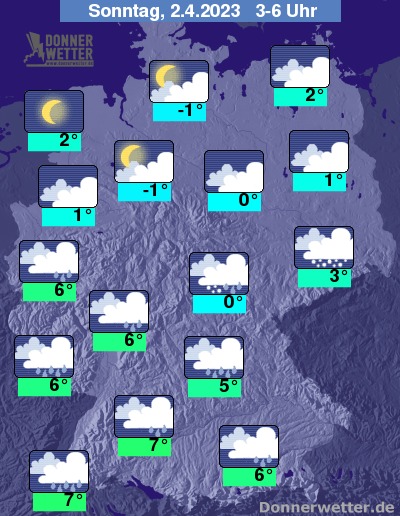 In der Nacht zum Sonntag zieht sich der Regen, zum Teil auch Schneeregen oder Schnee von der Südhälfte Deutschlands immer weiter nach Süden zurück. Vor allem im Norden, zum Morgen auch im Westen lockert und klart der Himmel häufig auf. Die Temperatur sinkt auf 7 Grad in Stuttgart und bis -1 Grad in Hannover.