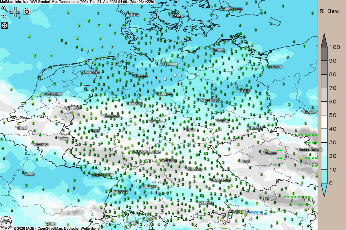 Diese Aufklarung hat unmittelbare Folgen für die Temperaturen. Während die Werte verbreitet zwischen 6 und 0 Grad liegen, sinkt das Thermometer – insbesondere im Norden – in den Frostbereich bis -2 Grad. Empfindliche Pflanzen sollten daher geschützt werden.