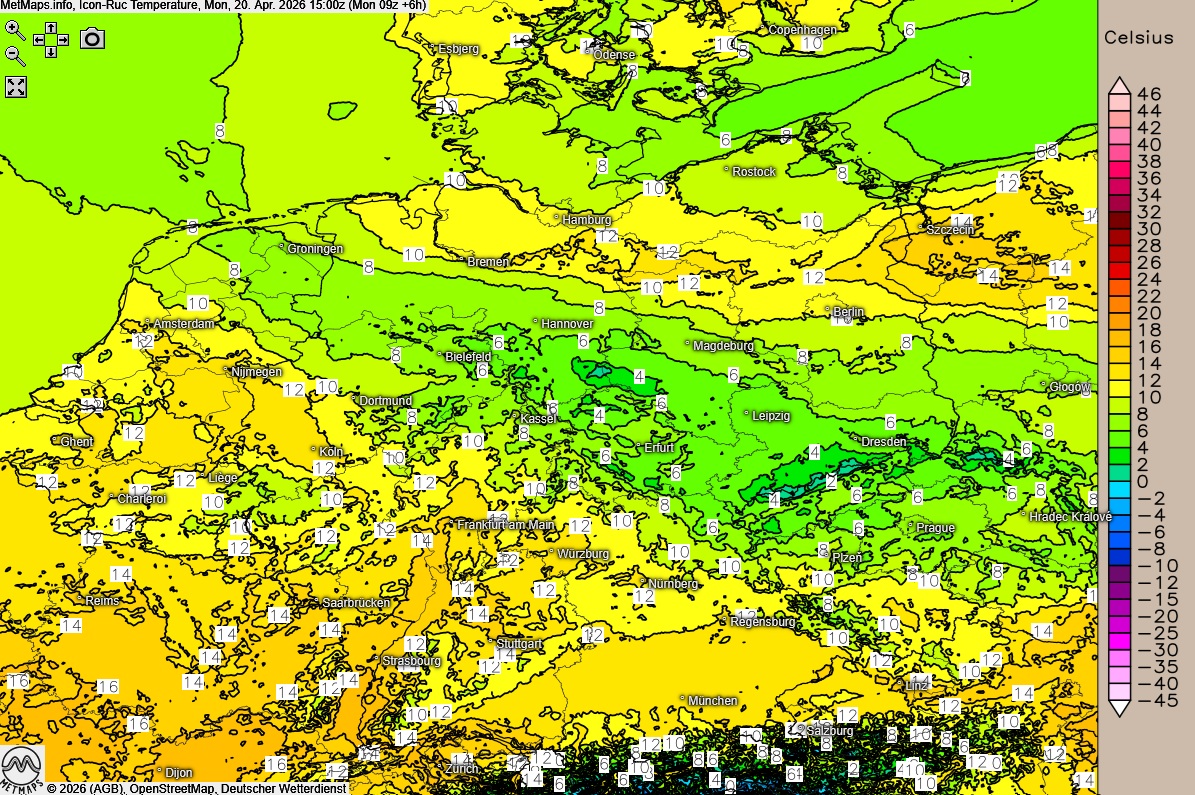 Temperaturen Montagnachmittag (15:00 Uhr) nach ICON-RUC