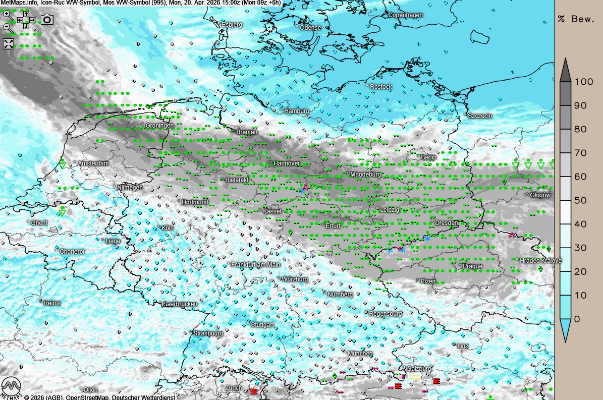 Wetterkarte Montagnachmittag (15:00 Uhr) nach ICON-RUC