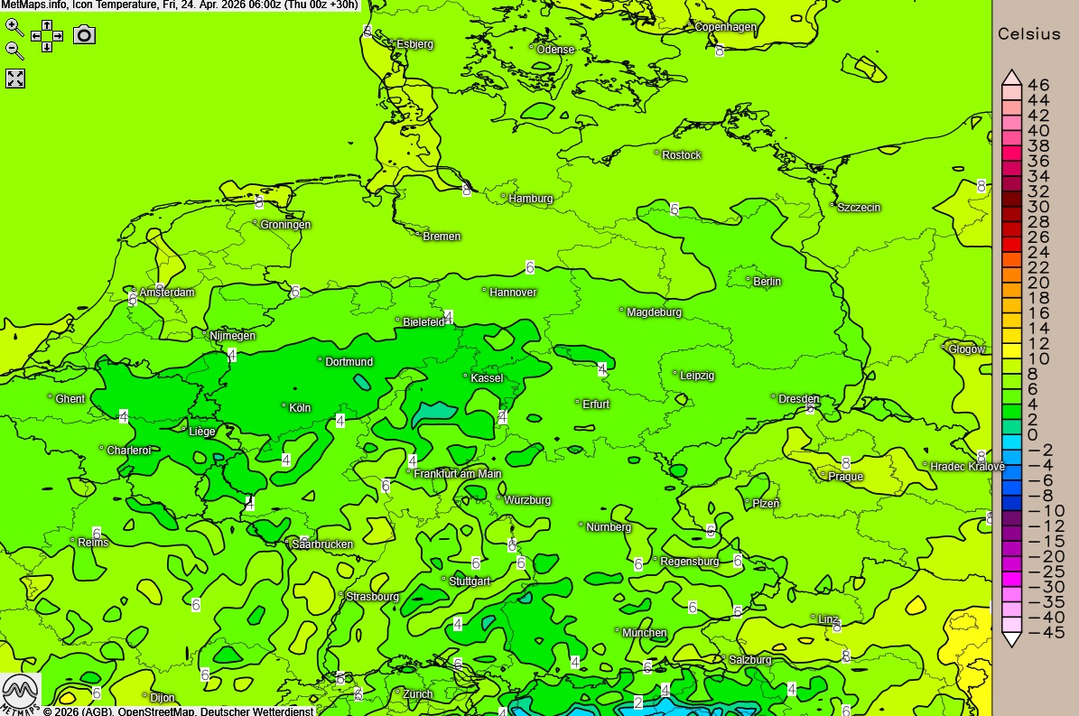 Die Lufttemperaturen für Freitag (06:00 Uhr) sowie die Wetterkarte für 12:00 Uhr nach ICON: