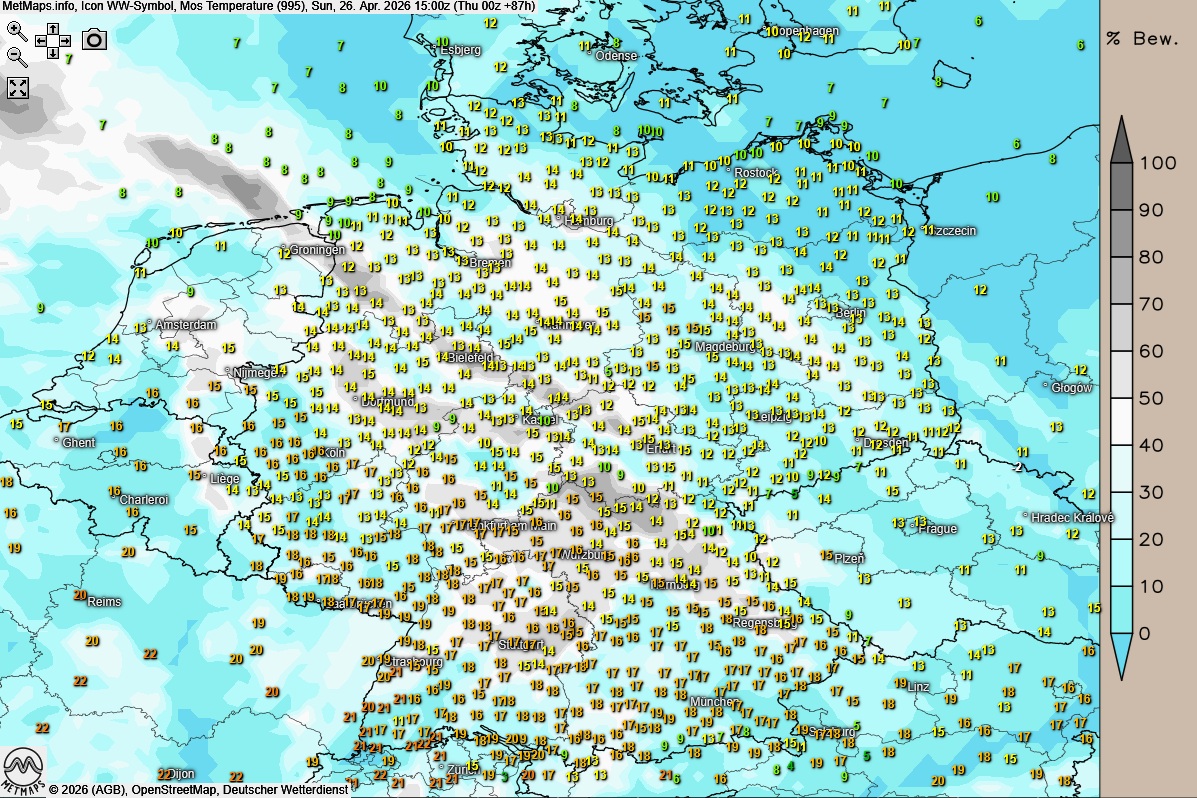 Die Wetter- und Temperaturkarte für Sonntagnachmittag (15:00 Uhr) nach ICON: