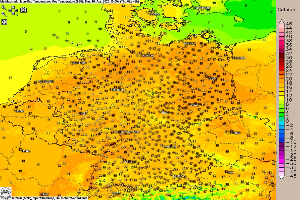 Die Temperatur- und Wetterkarte für 06:00 / 12:00 Uhr sowie die Temperaturabweichung Europa um 15:00 Uhr nach ICON: