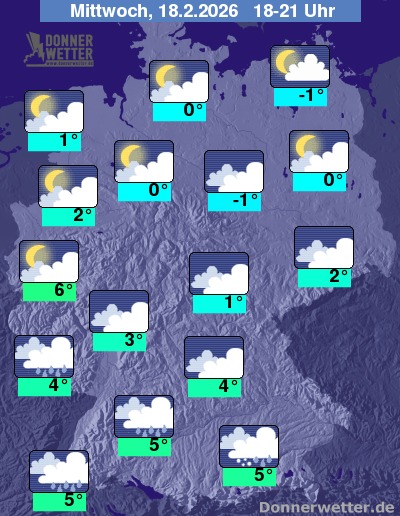 Heute Abend fällt über dem Südwesten des Landes unter dichten Wolken verbreitet Regen, zum Teil auch Schneeregen. Im Norden und Nordosten ist es oft locker bis aufgelockert bewölkt, sonst ist es meist stark bewölkt, aber ebenfalls trocken. Die Temperatur liegt bei -1 Grad an der Müritz und bis 6 Grad in der Kölner Bucht.