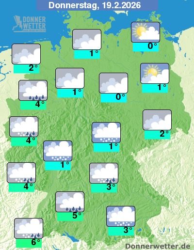Am Donnerstag zeigt sich der Nordosten des Landes teils heiter und dazu trocken. Im übrigen Land bleibt es weitgehend bedeckt und über der Südwesthälfte fällt zeitweise Schnee oder Regen. In den übrigen Landesteilen bleibt es aber weitgehend trocken. Die Temperatur erreicht 0 Grad an der Ostsee und bis 6 Grad am Oberrhein.