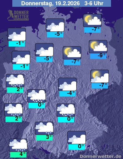 In der Nacht zum Donnerstag breiten sich Regen, Schneeregen und Schnee bis über die gesamte Südwesthälfte Deutschlands aus. Weiter nach Nordosten bleibt es weitgehend trocken und im Osten und Nordosten ist der Himmel auch oft locker, sonst jedoch meist stark bewölkt. Die Temperatur sinkt auf 4 Grad im Breisgau und bis -9 Grad im Berliner Umland.